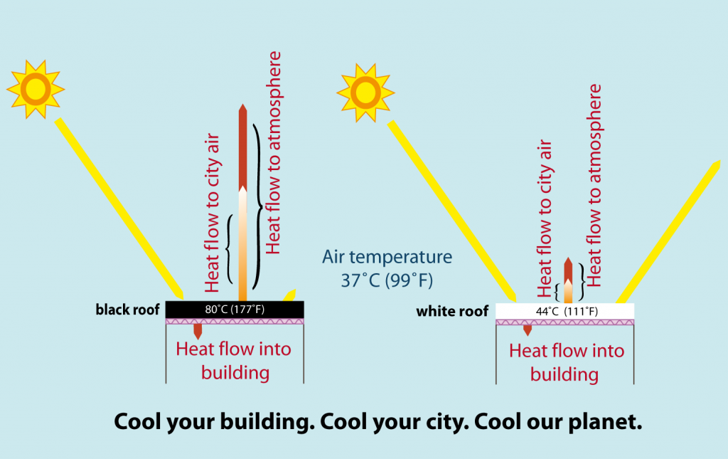 Because white roofs reflect far more of the sun’s heat than black ones, buildings with white roofs will stay cooler. If the building is air conditioned, less air conditioning will be required, thus saving energy.